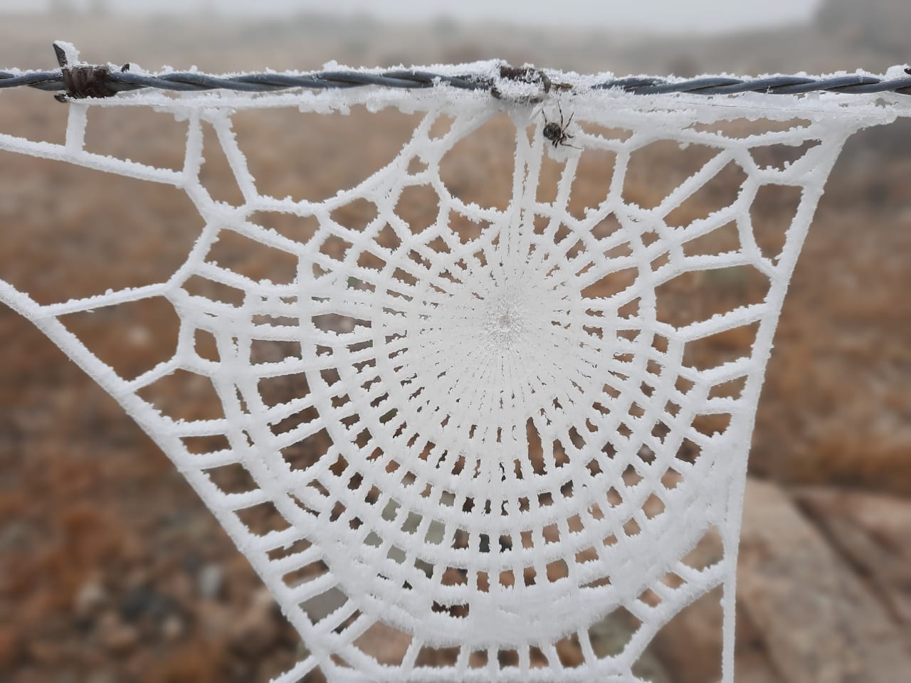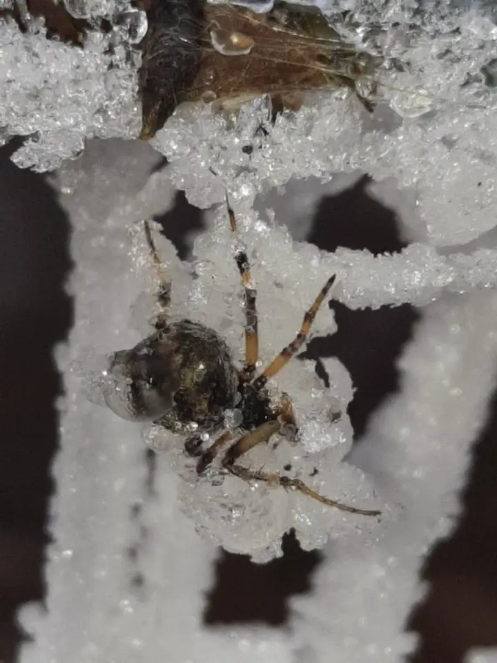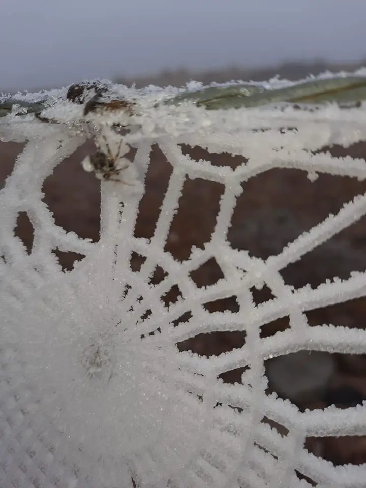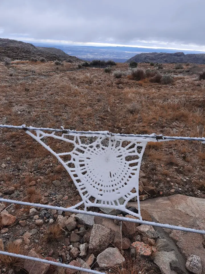 José Zárate. del Parador Nacimiento Río Mina Clavero, compartió increíbles fotos de una tela de araña y su araña congeladas. Esta tarde, en ese lugar la temperatura era de 6 grados.