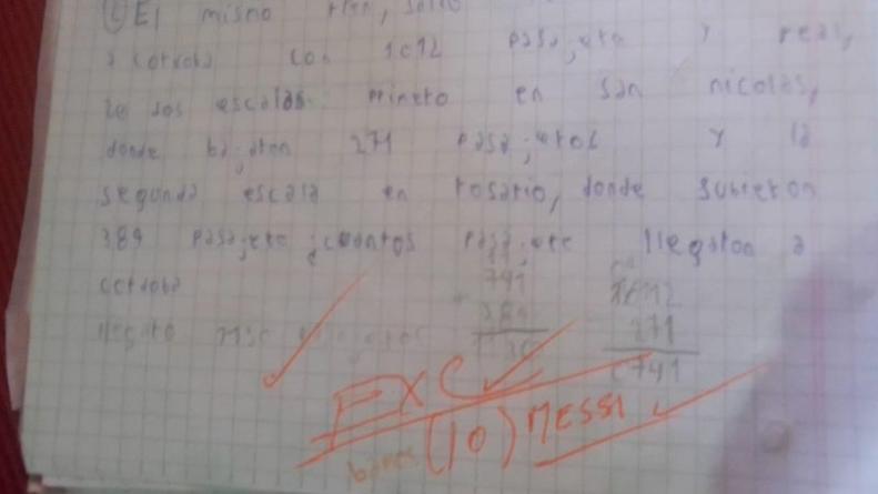 El profe Carlos le entregó la carpeta a Kevin y, al final de la serie de problemas que había realizado, le escribió un curioso mensaje. “Excelente (10) Messi”, se alcanza a leer en color naranja en la hoja.