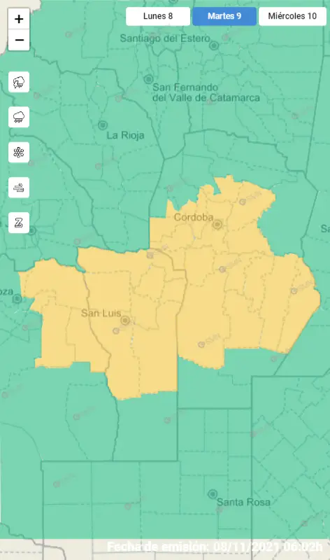 La alerta se extenderá durante la jornada del martes y no sólo abarcará gran parte e territorio cordobés, sino también las provincias de San Luis y Mendoza.