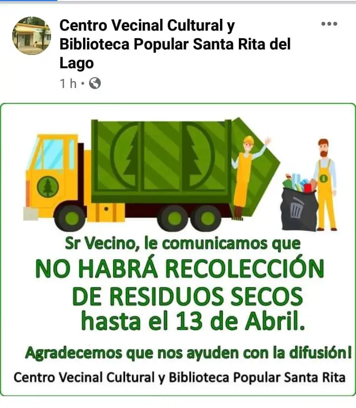 La información surge luego de los reclamos que realizaron los vecinos a nuestro medio. Si bien no hubo comunicación oficial del municipio al respecto, algunos centros vecinales comunicaron a los vecinos esta la situación: hasta el 13 de abril no habrá recolección de secos.