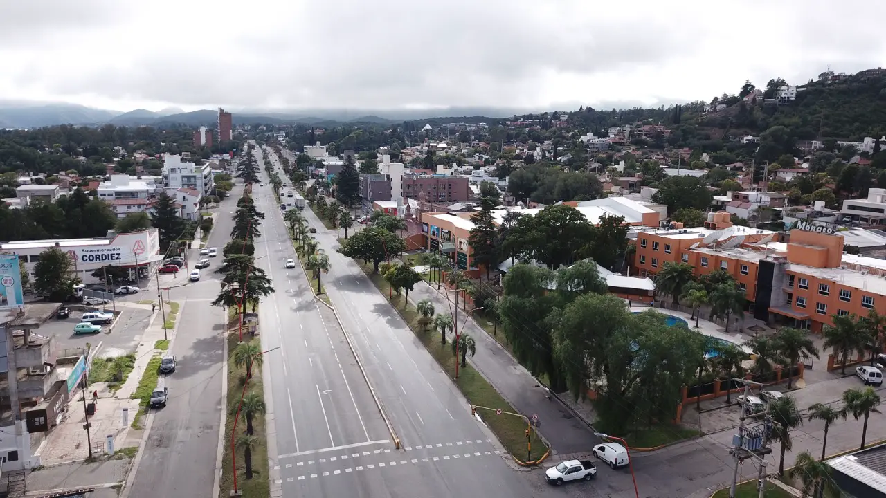 Con un barbijo adecuado, Dron Ramón gana altura desde el Hotel Mónaco y se posiciona sobre la Avenida San Martín para tener un panorama de la situación.