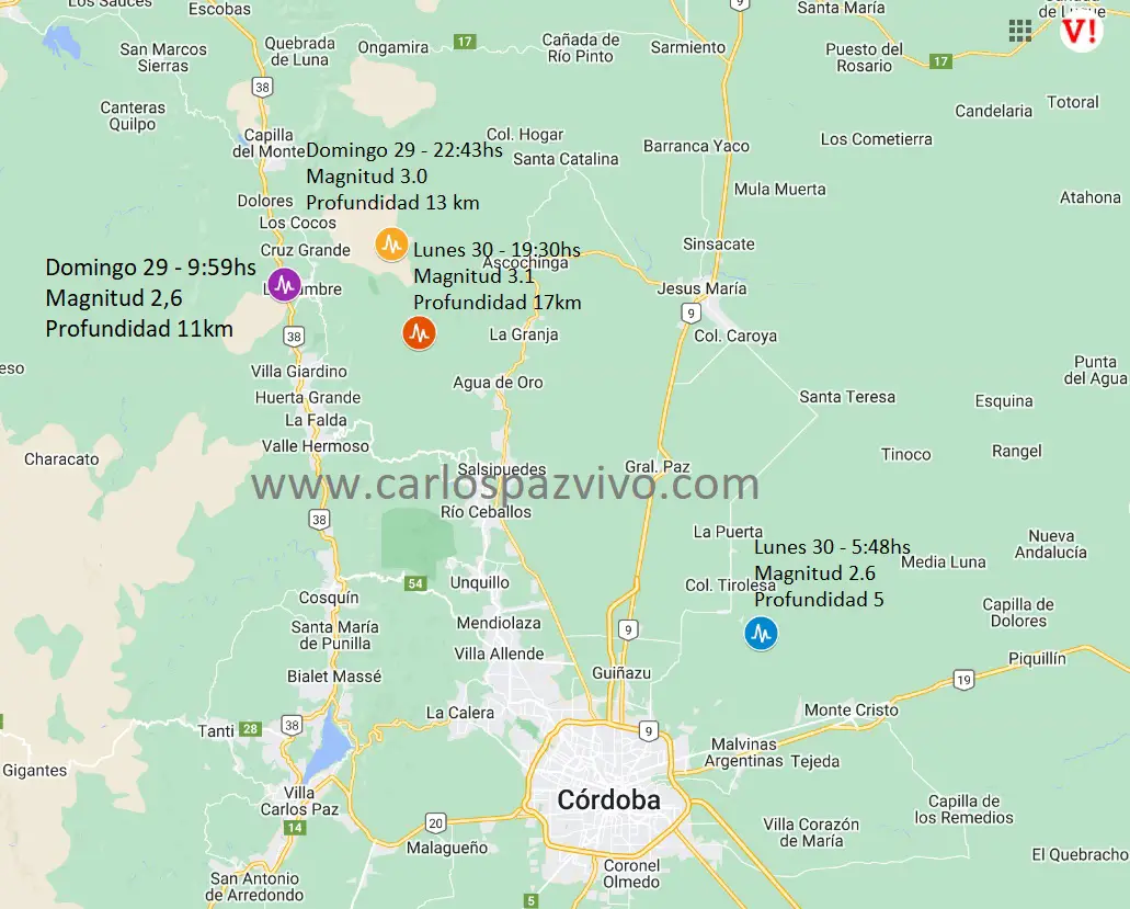 Posteriormente, a las 22:43 del mismo día, otro movimiento alcanzó una magnitud de 3.0 y una profundidad de 13 kilómetros. Este movimiento registró su epicentro entre La Cumbre y Ascochinga.