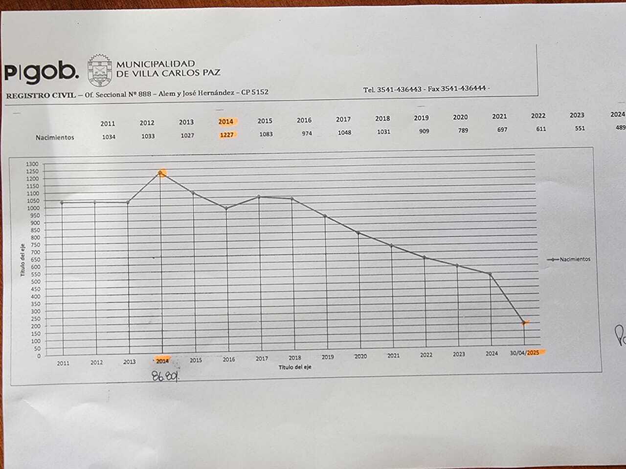 La imagen de un gráfico en papel, con cifras en descenso y trazos que marcan una curva empinada hacia abajo, fue la forma que eligió Marta Zilli, titular del Registro Civil de Villa Carlos Paz, para mostrar un fenómeno que inquieta tanto como sorprende: la natalidad en la ciudad ha caído de manera estrepitosa.
