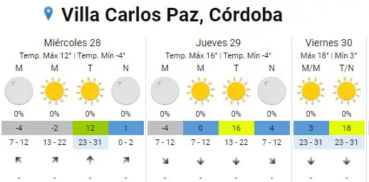 Específicamente para el Valle de Punilla el alerta anuncia que “el área será afectada por bajas temperaturas, por debajo de valores normales, al menos hasta la mañana del jueves 29. Se espera que las temperaturas mínimas estén entre -6 °C y 6 °C, mientras que las temperaturas máximas oscilarán entre 10 °C y 17 °C.”
