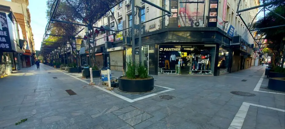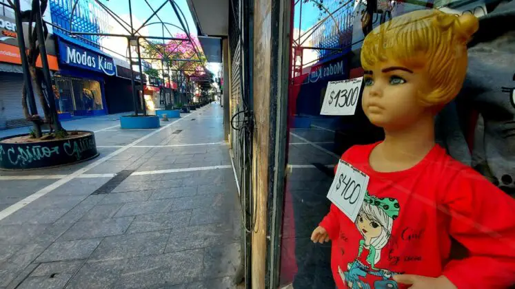 Calles vacías, policías dubitativos, enfermeras cansadas, gente de a pié esperando hisoparse, deliverys a rolete, taxistas enojados, más calles desiertas, vidrieras frías, persianas bajas, perros solitarios, cúpulas religiosas sin mensaje, veletas mudas, papeles al viento, cafetero una carroza fúnebre y un féretro solitario, ¡Oh! en el shopping cerrado, la Casa Radical doblada, el Puente Antártida helado… la San Martín desolada… y un maniquí loco por salir…
