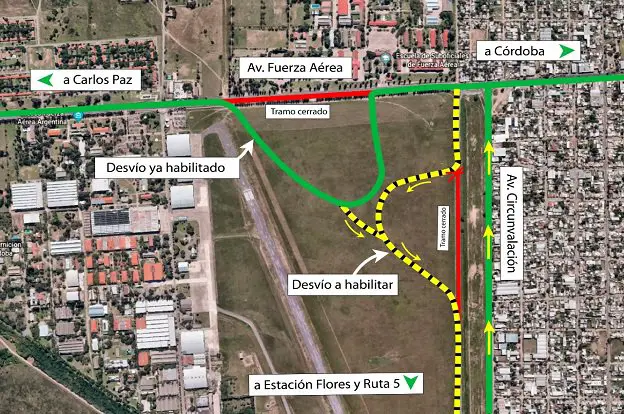 Debido a los trabajos por el avance de la obra de Circunvalación Sur de la ciudad de Córdoba, desde este domingo se implementa un nuevo desvío, que afecta únicamente a quienes circulen desde Ruta 20 ó Av. Fuerza Aérea con destino hacia Ruta 5 o Autopista Córdoba – Villa María.