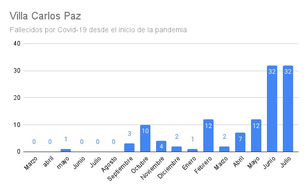 Este viernes, el municipio de Villa Carlos Paz informó una nueva muerte por Covid-19 en la ciudad. Hasta el momento, se produjeron 32 muertes en lo que va de julio, la misma cantidad que en el mes de junio de este año.