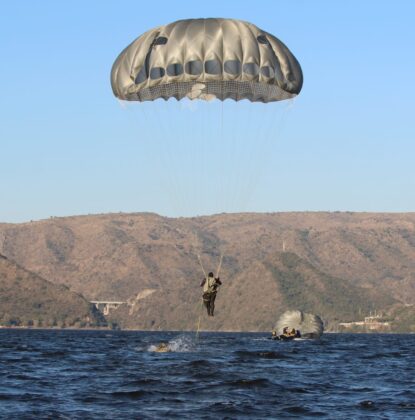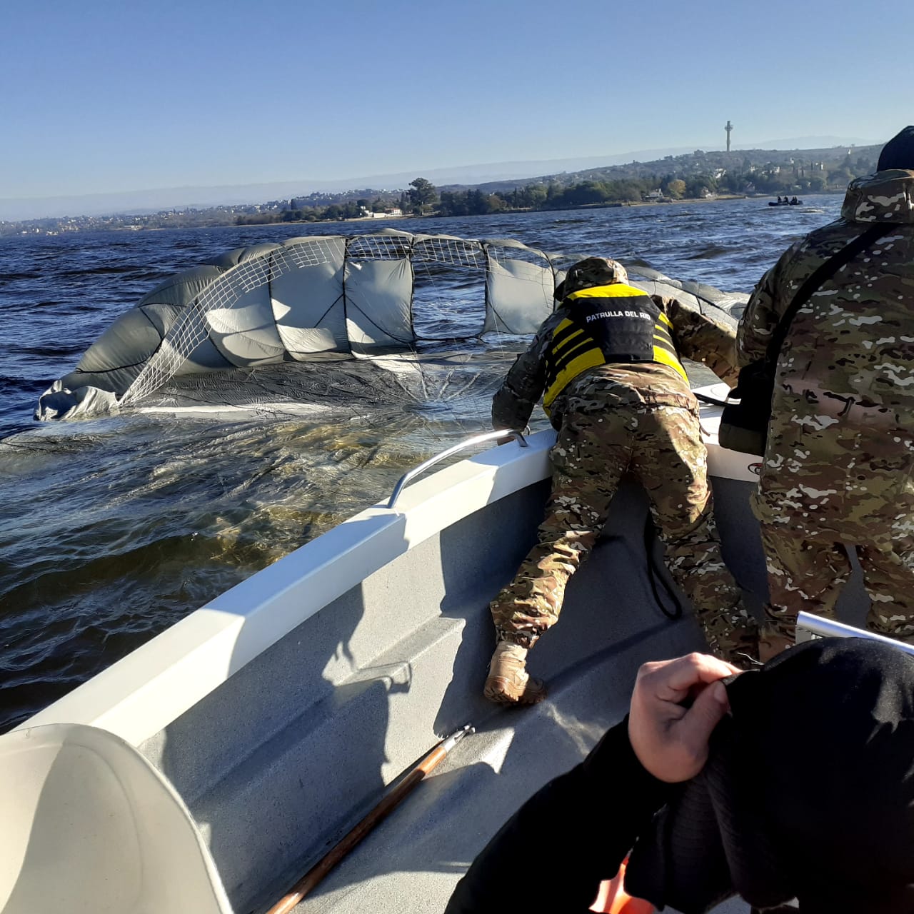 Además, detalló que “50 metros antes de tocar el espejo de agua, se desprenden bandas del paracaídas, quedando el individuo únicamente agarrado por una banda en la entrepierna. Se cruzan los brazos por arriba para que el mismo siga armado para entrar al agua y un mosquetón que será liberado para llegar libremente al agua sin estar atado a ningún arnés ni cuerda del paracaídas, lo cual sería peligroso”.