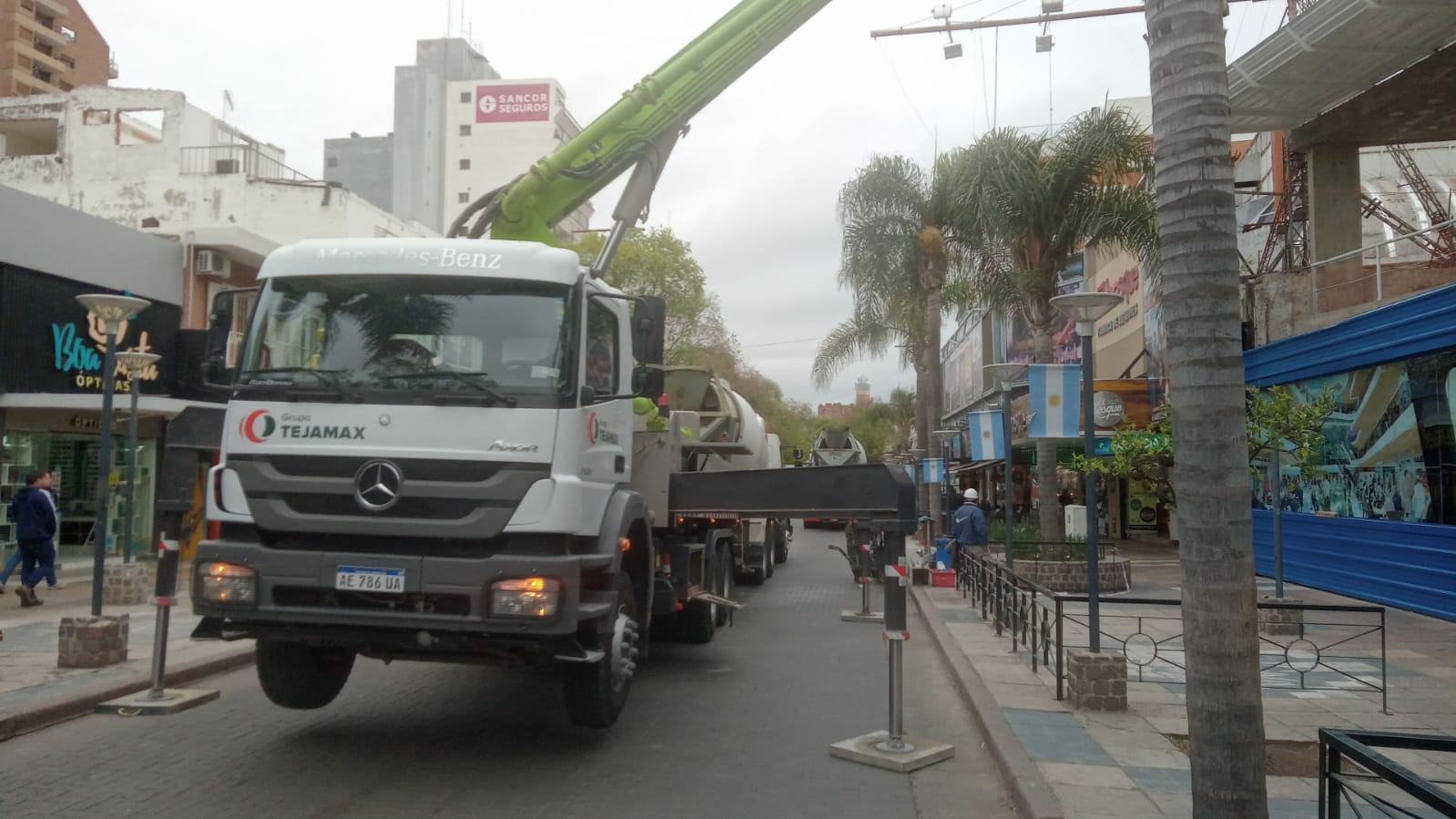 El tránsito se interrumpió entre las calles San Martín y Montevideo, debido al ingreso camiones con cemento y otros materiales que llegan al lugar para ser usados en la edificación de un shopping, ubicado sobre la arteria principal del centro.