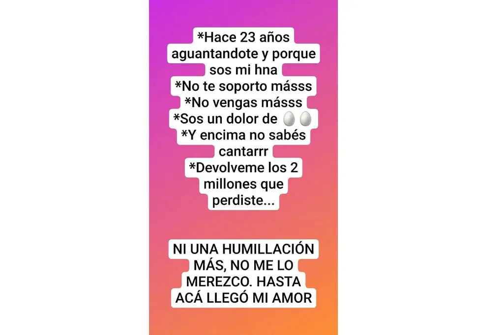 Romina eligió listar algunas frases que le habría dicho Pablo en reiteradas oportunidades: “Hace 23 años aguantándote y porque sos mi hermana. No te soporto más. No vengas más. Sos un dolor de (junto a dos emojis de huevos). Y encima no sabés cantar. Devolveme los dos millones que perdiste”.