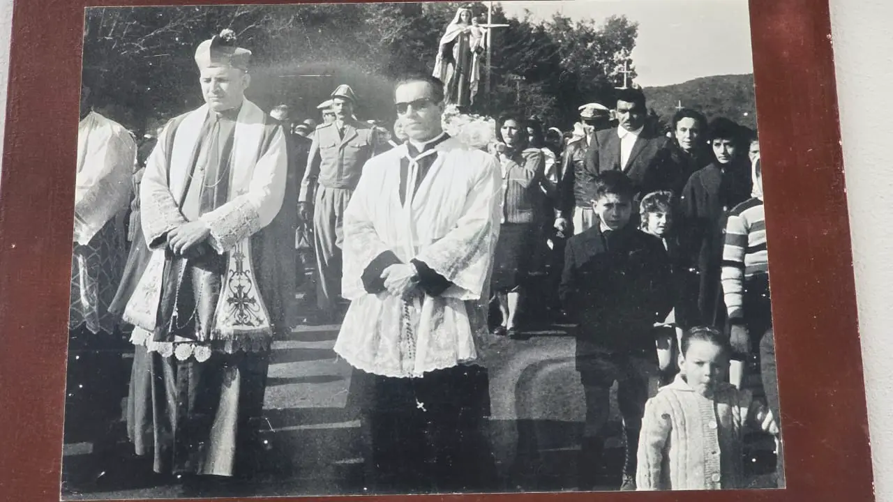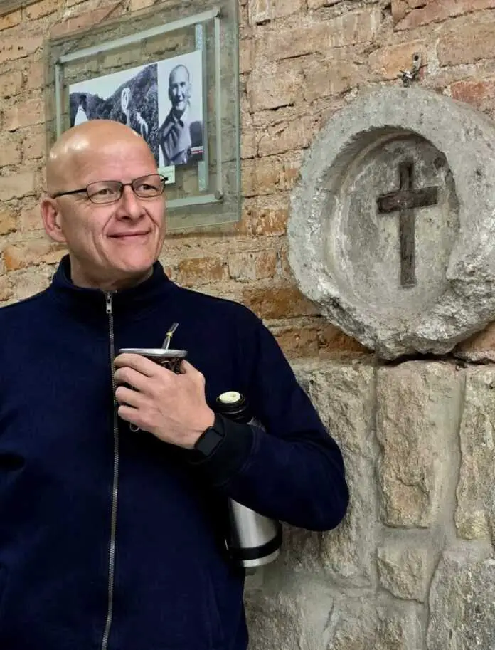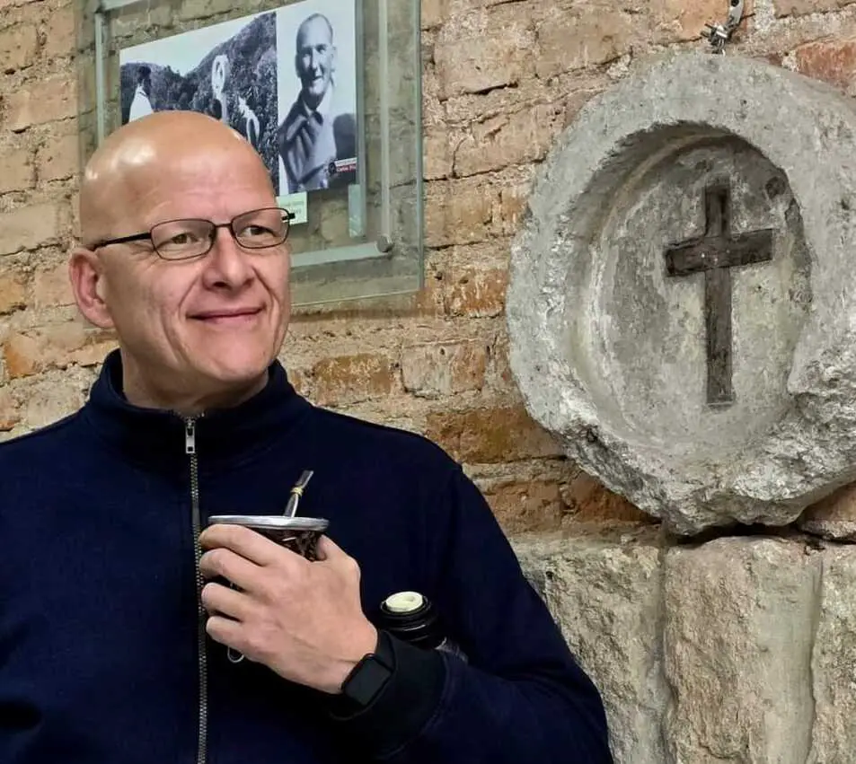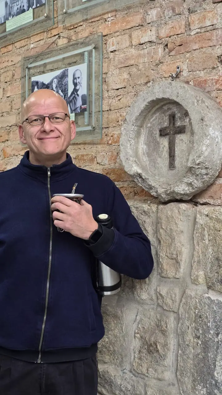 Detrás de Pablo y su infusión, el recio muro/cimiento de piedra de la zona y más arriba las hileras de ladrillos históricos, quemados en el Barrio El Escondrijo, que dan al altar del templo mayor de Carlos Paz. Estamos en el espacio físico de la antigua capillita que LPP (La Piqueta del Progreso) se llevó en tiempos del Cura Santarrosa y que en años del Padre Daniel Frattin se ‘rescató’ al menos como se pudo. Hoy está repleta de recuerdos bañados por luz… ¿celestial? como esa estación del ViaCrucis rescatada de la montaña alguna vez, o como esa foto de Don Bernardo Delía (uruguayo y Cura ad hoc) que parece estar ‘mangueándole’ un amargo al Padre Pablo.