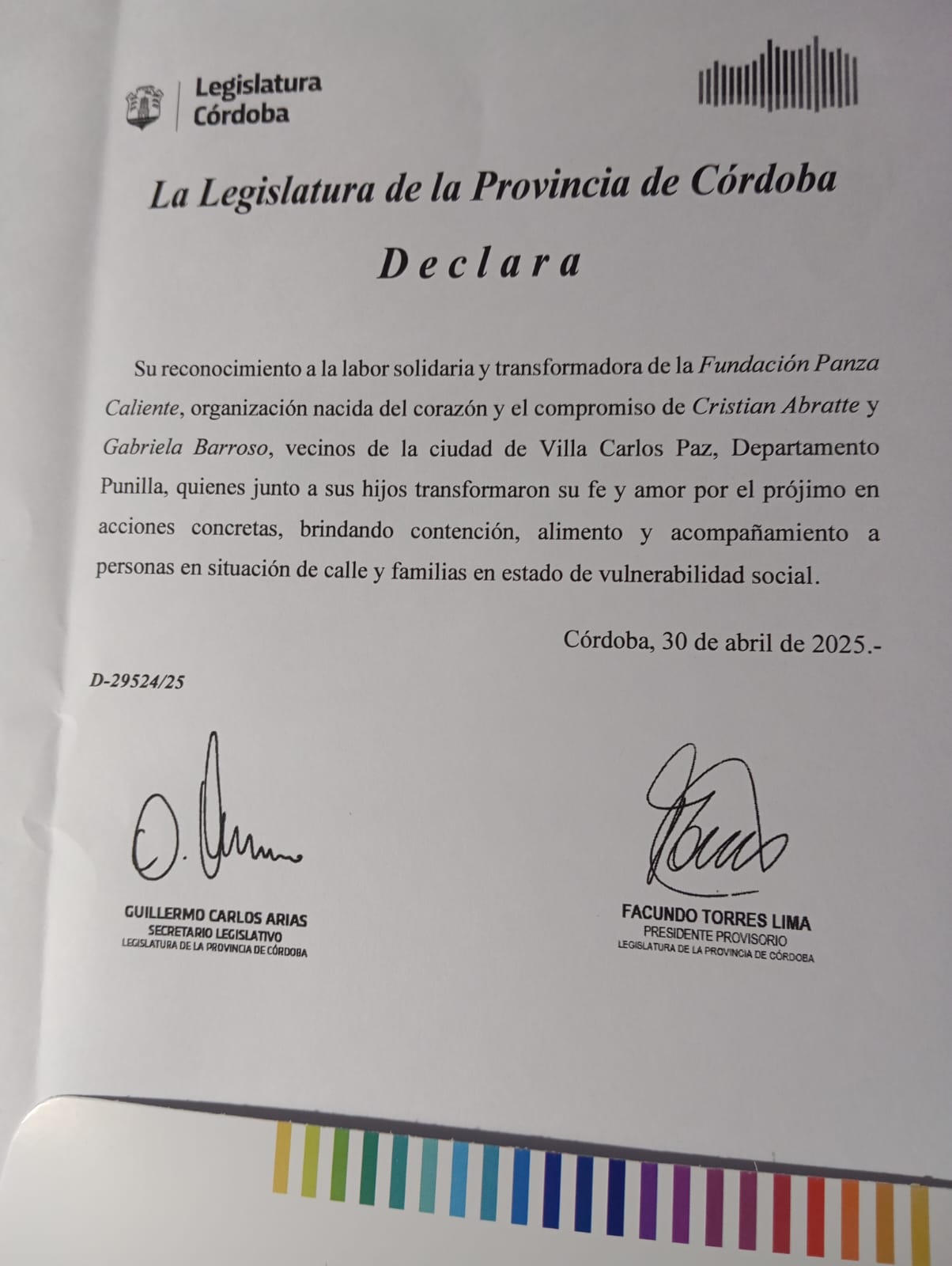 «La Legislatura de la Provincia de Córdoba, declara su reconocimiento a la labor solidaria y transformadora de Panza Caliente, organización nacida del corazón y compromiso de Cristian Abratte y Gabriela Barroso, vecinos de la ciudad de Villa Carlos Paz, Departamento Punilla, quienes junto a sus hijos, transformaron su amor y fe por el prójimo en acciones concretas, brindando contención, alimento y aompañamiento a personas en situación de calle y familias en estado de vulnerabilidad social», versa el texto de la distinción otorgada por la Legislatura Provincial.