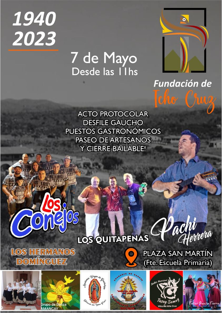El próximo domingo 7 de mayo vamos a celebrar el 83º aniversario de Icho Cruz y están todos invitados a participar de las diferentes actividades que se llevarán a cabo en la plaza central.