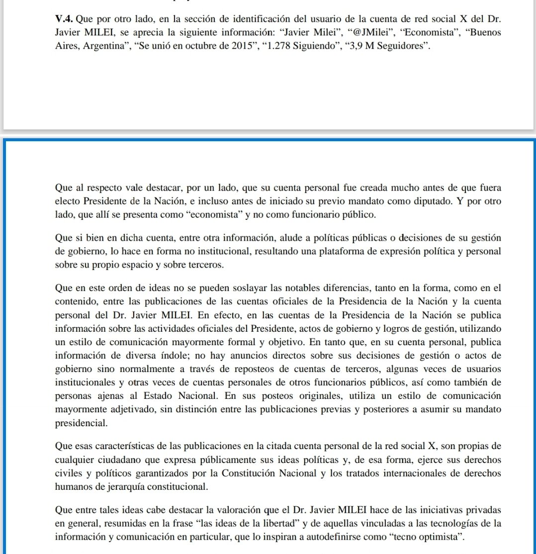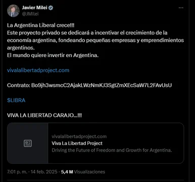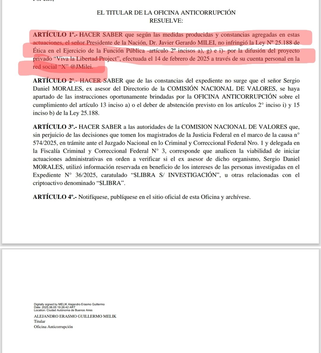 Según detalla el artículo 1, Milei “no infringió la Ley N°25.188 de Ética en el Ejercicio de la Función Pública por la difusión del proyecto privado ‘Viva la Libertad Proyect’, efectuada el 14 de febrero de 2025 a través de su cuenta personal en la red social X @JMilei“.