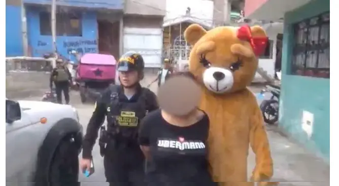 🇵🇪 En Perú un oficial de Policía se disfrazó de osito en San Valentín para visitar a unas mujeres narcotraficantes apodadas «la tóxica» y «la romántica».