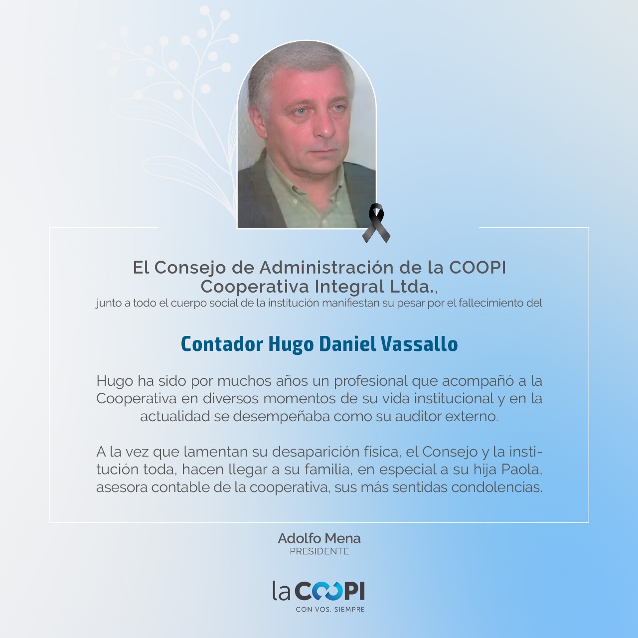 El Consejo Directivo de la Cooperativa Integral emitió un comunicado en el que manifiesta su pesar por la desaparición física del profesional.