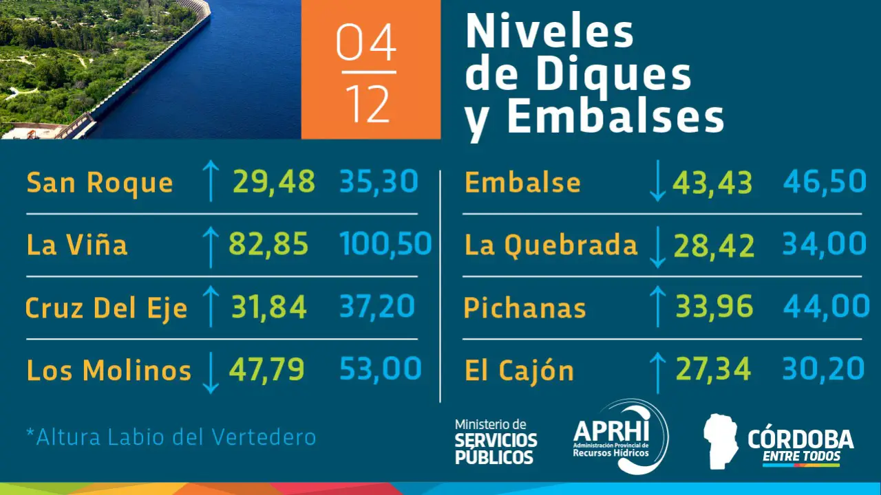 Según datos aportados por el Ministerio de Servicios Públicos de la Provincia, desde el pasado lunes 30 de noviembre hasta este viernes 4 de diciembre, el lago San Roque sólo subió 31 centímetros y se ubica 5,82 metros por debajo del nivel del vertedero; es decir, con una altura de 29,48 metros.