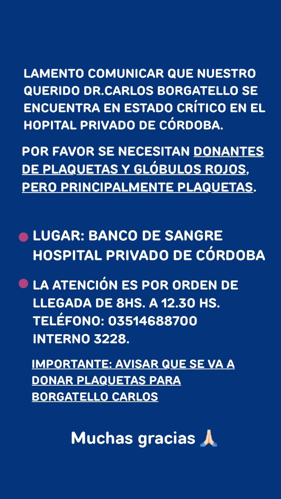 Los familiares y allegados al médico Carlos Borgatello, un profesional muy querido de las comunidades del Valle de Punilla, solicitaron la colaboración de la comunidad ante la necesidad de donantes de sangre.