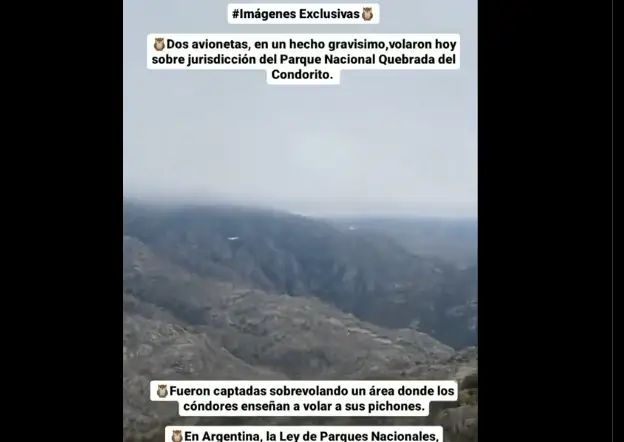 El 18 de mayo pasado se registró un video en el que se observan 3 avionetas sobrevolando el Parque Nacional Quebrada del Condorito.