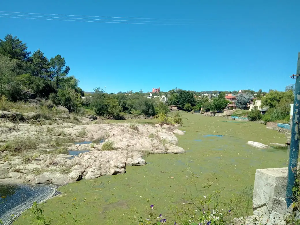 El arroyo Los Chorrillos tiene una alfombra verde en su superficie en la zona de El Diquecito.