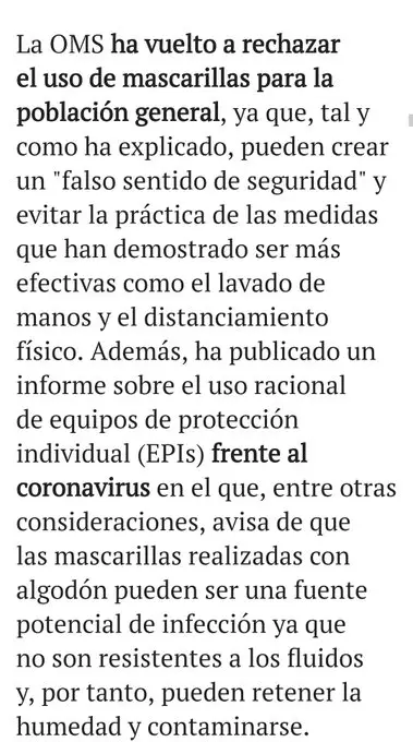 Para la Organización Mundial de la Salud, el uso generalizado del barbijo NO está recomendado por varias razones. En primer lugar, según la OMS, porque otorga un “falso sentido de la seguridad”, y eso genera que las personas no realicen las medidas más efectivas como el lavado de manos y el distanciamiento social.