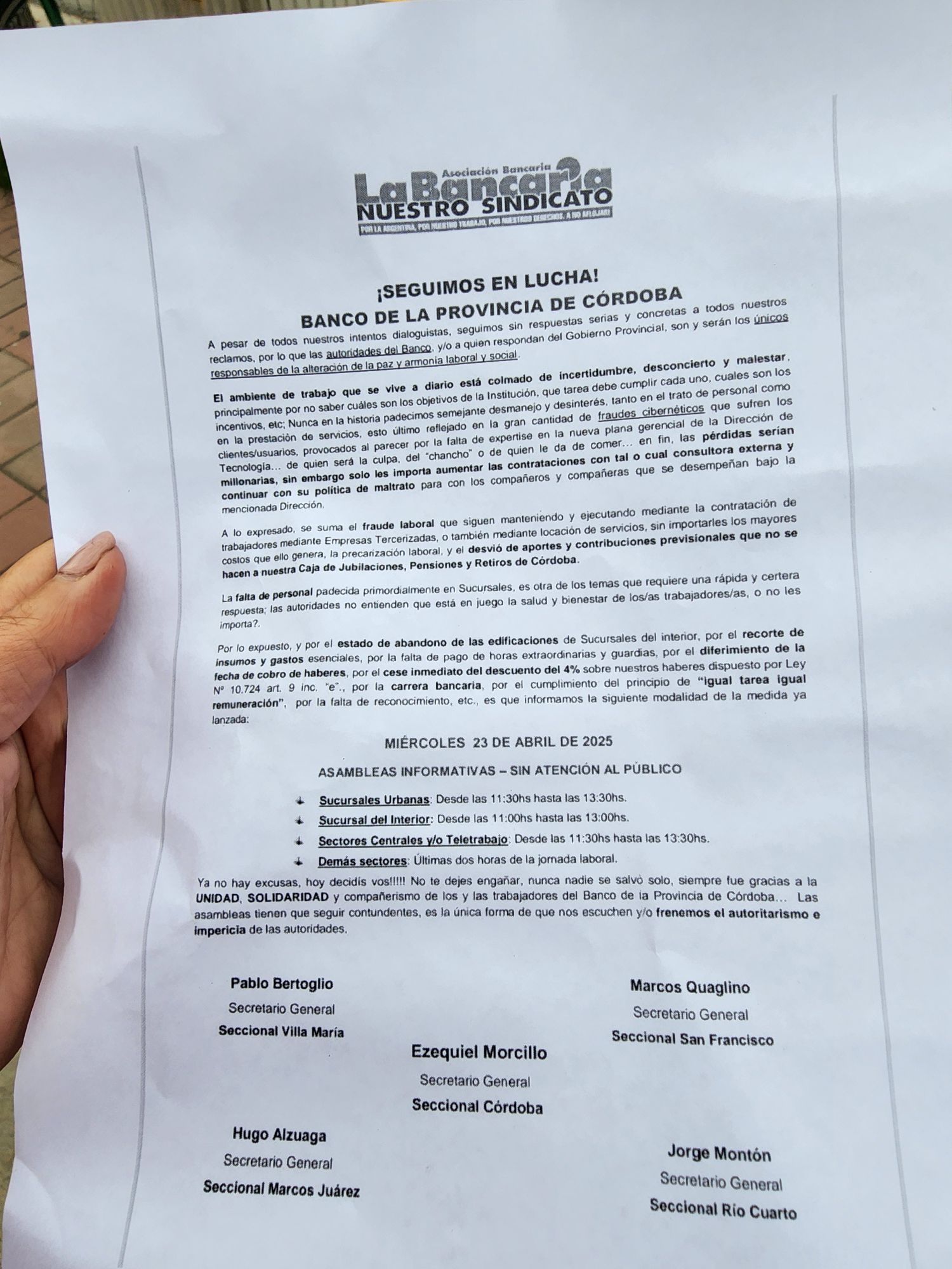 El conflicto en el Banco de la Provincia de Córdoba se profundiza. Este miércoles 23 de abril, los empleados nucleados en la Asociación Bancaria realizaron nuevas asambleas informativas con cese de atención al público en todas las sucursales de la provincia, incluyendo la de Villa Carlos Paz.