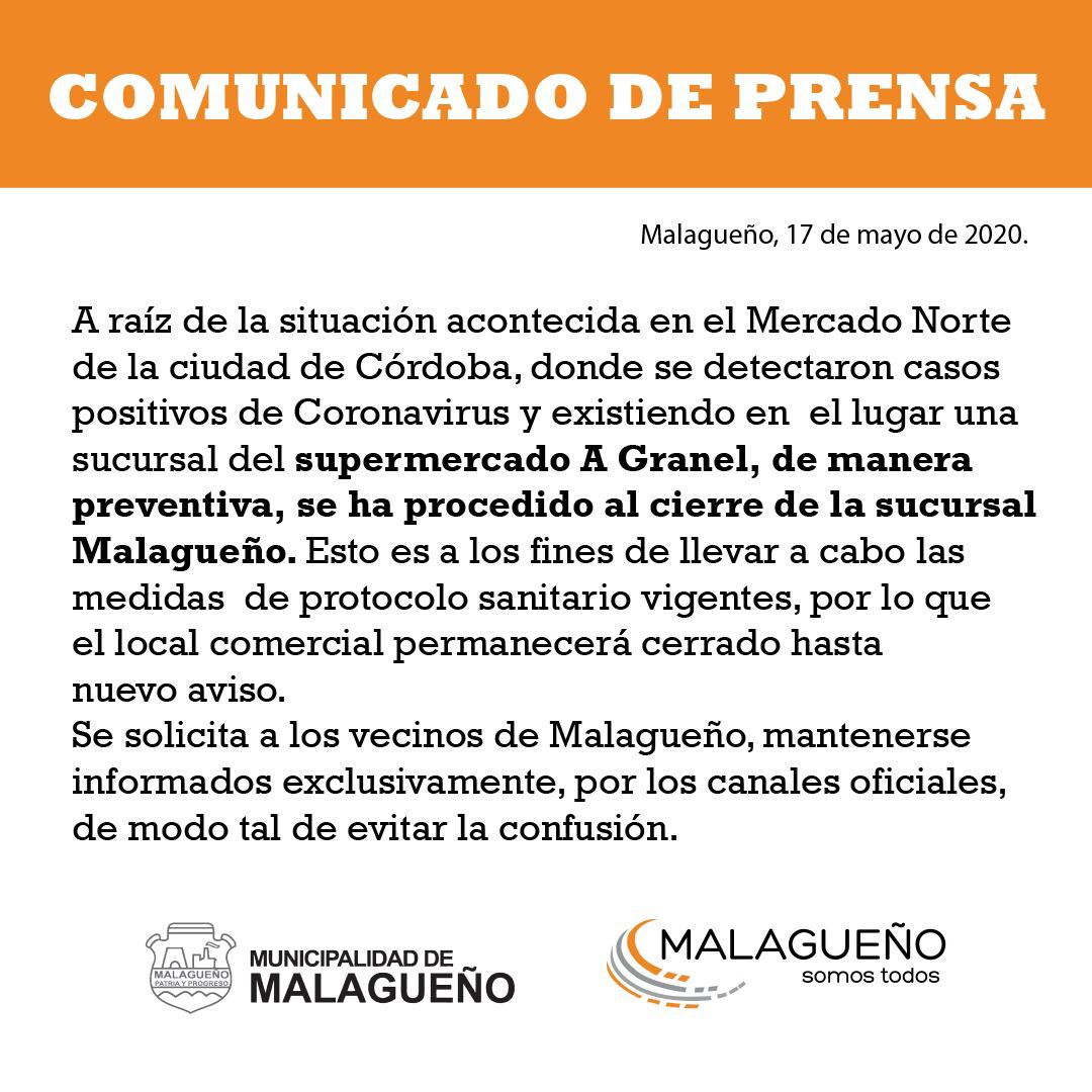 La municipalidad de Malagueño decidió cerrar el supermercado “A granel” de esa localidad como consecuencia del brote de Covid-19 con 4 casos que se produjo en el mercado Norte de Córdoba.