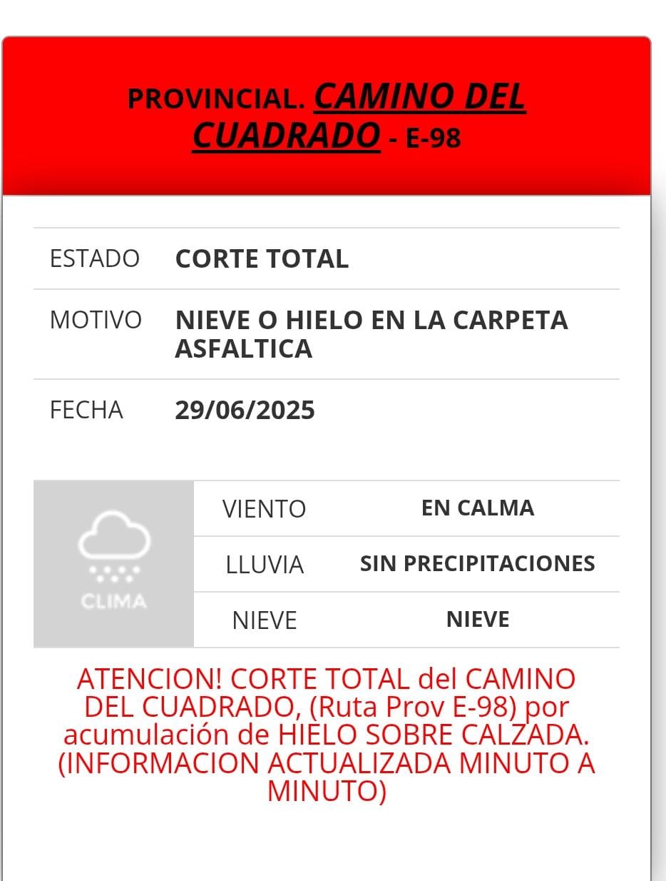 En tanto, también se dio aviso del corte del Camino del Cuadrado por la misma situación.