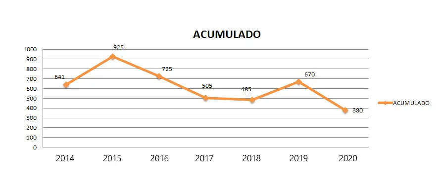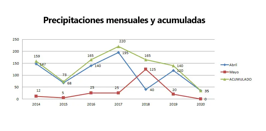 Si volvemos sobre los números de los 5 primeros meses del año, de los últimos 7 años, sin dudas 2020 es el que menos precipitaciones registra.