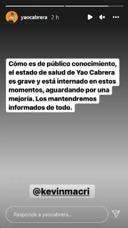 “Como es de público conocimiento, el estado de salud de Yao Cabrera es grave y está internado en estos momentos, aguardando por una mejoría. Los mantendremos informados de todo”, señala la historia en la que arroba Kevin Macri, youtuber y también amigo de Cabrera.