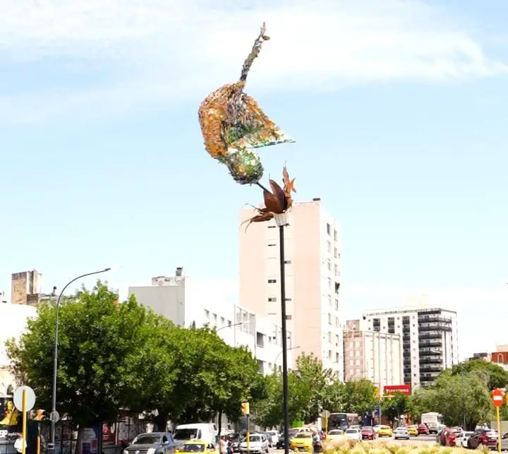 Un “Colibrí” fabricado a partir de más de 1500 latas se levanta en la rotonda de Bv. Perón y Rosario de Santa Fe.