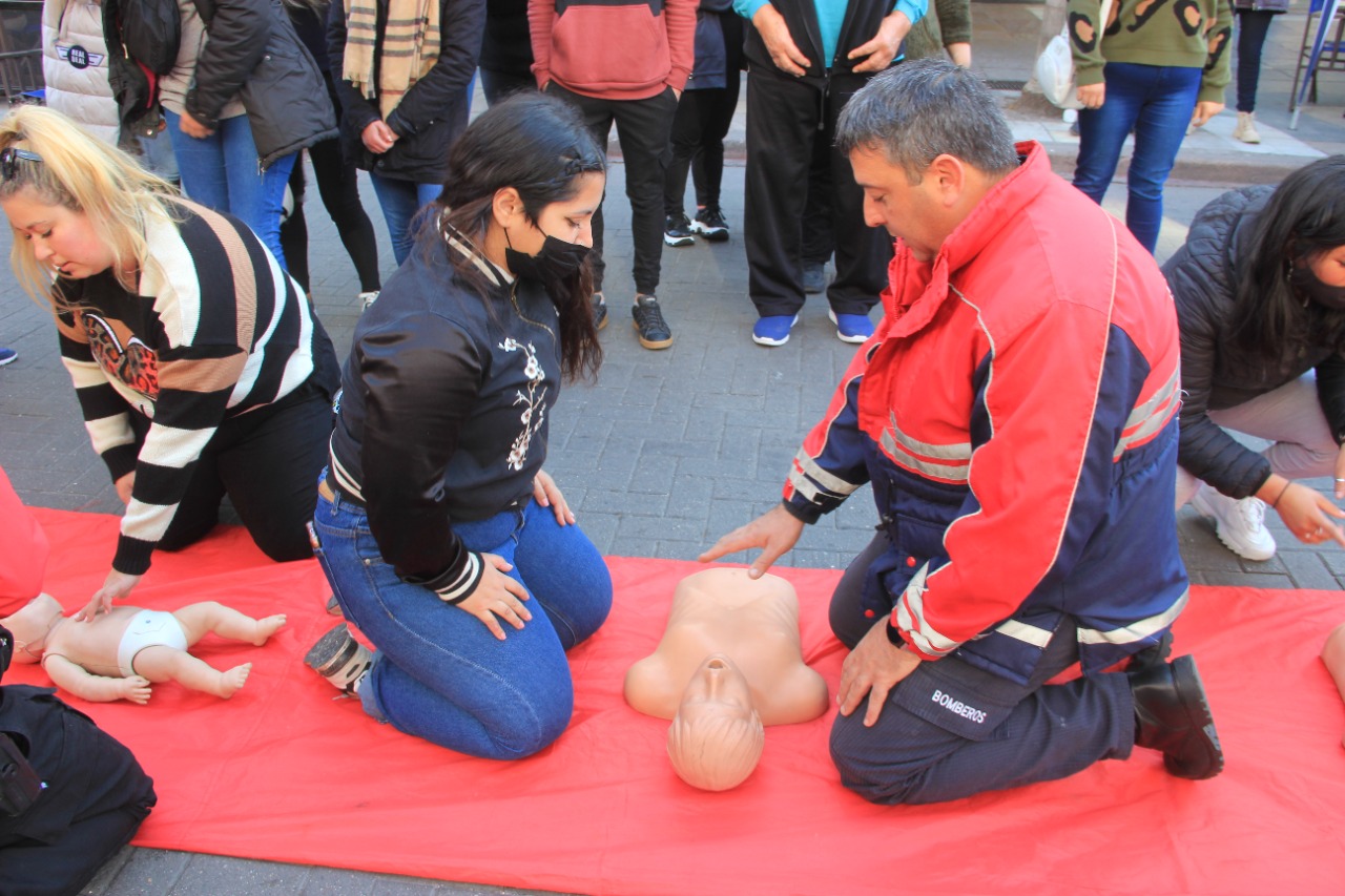 Desde las 10 y hasta las 13 horas, profesionales del Hospital Municipal Gumersindo Sayago, DUAR, Cuerpo Especial de la Policía, Bomberos Voluntarios y Policía, capacitaron a más de 90 personas que trabajan en diversos locales céntricos, con el objetivo de que estén preparados y sepan actuar ante cualquier emergencia que tenga como víctima a cualquier persona, ya sean clientes o compañeros de trabajo.