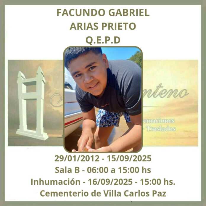 La familia y la comunidad educativa del Ipem Arturo Illia de Carlos Paz despide este martes a Facundo Gabriel Arias Prieto, el estudiante de 13 años que falleció este lunes luego de sufrir una descompensación en una clase de educación física en la plaza de la escuela.