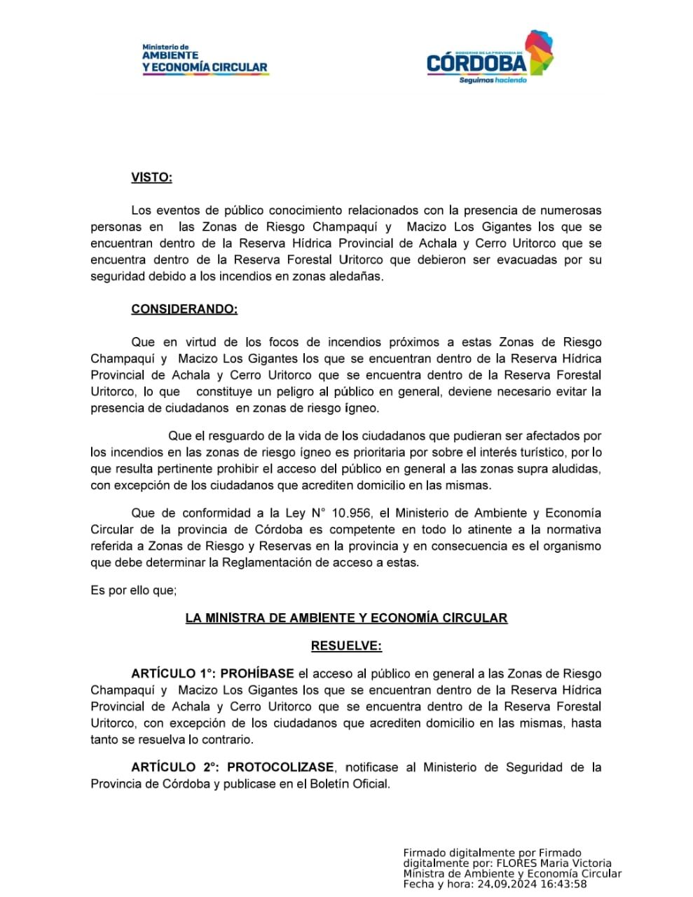 El Gobierno de Córdoba ha prohibido temporalmente el acceso a las zonas del Cerro Champaquí, Cerro Uritorco y el Macizo Los Gigantes, debido al riesgo de incendio existente y para preservar estas áreas protegidas.