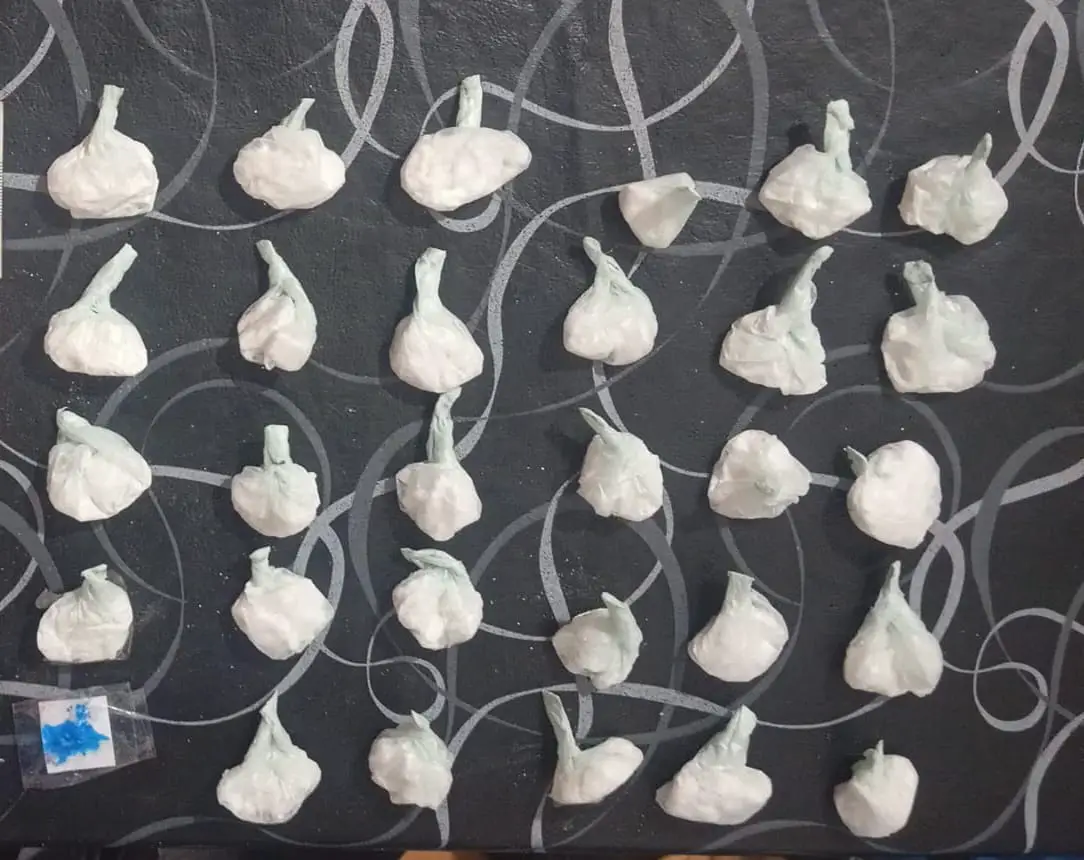 Durante la requisa, los uniformados detectaron que el joven transportaba entre sus pertenencias una bolsa de plástico con 29 envoltorios de nylon que contenían una sustancia polvorienta blanca.