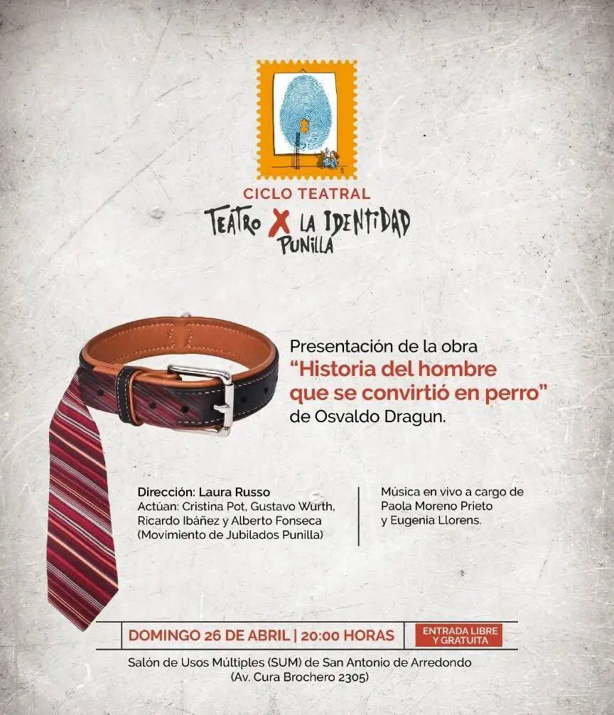 El próximo domingo 26 de abril, a las 20 hs, se presentará la obra “Historia del hombre que se convirtió en perro”, del reconocido dramaturgo argentino Osvaldo Dragún.