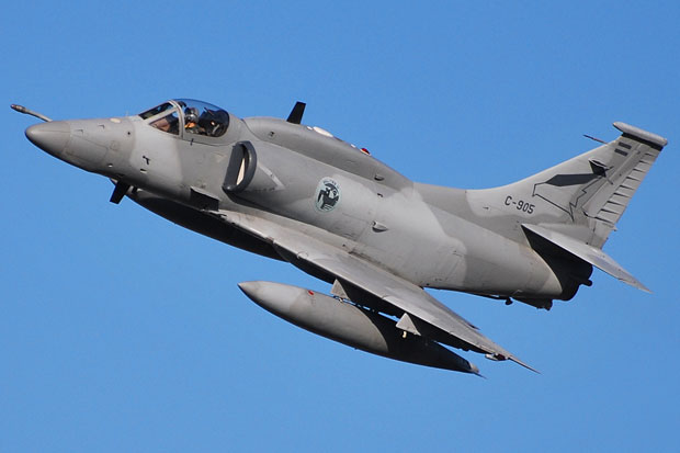 Se trata de un avión de combate A-4AR Fightinghawk, de la Fuerza Aérea Argentina, que voló sobre Punilla.