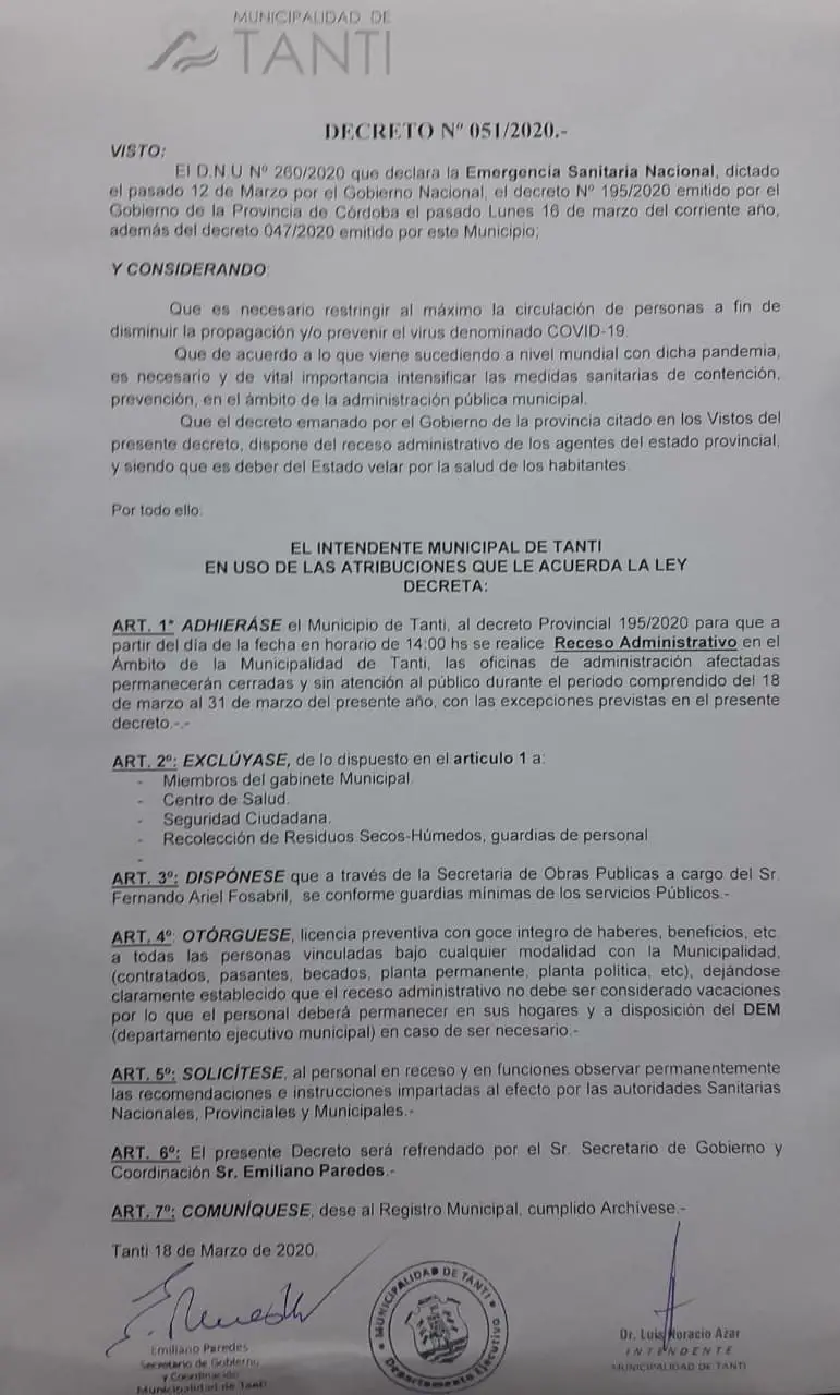 Tanti se encuentra virtualmente paralizado, por una medida similar a la de La Cumbre. «No se puede pasear por la ciudad, si son turistas deben seguir de largo o volverse», señaló el Secretario de Gobierno Emiliano Paredes a CarlosPazVivo!.