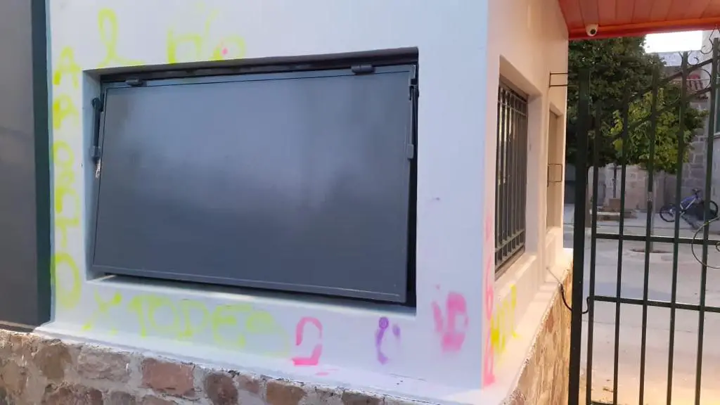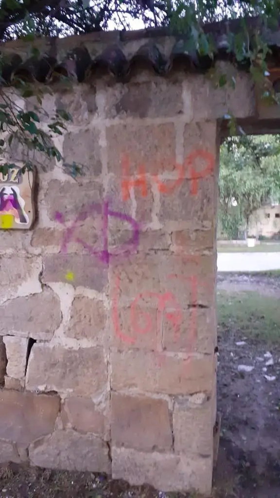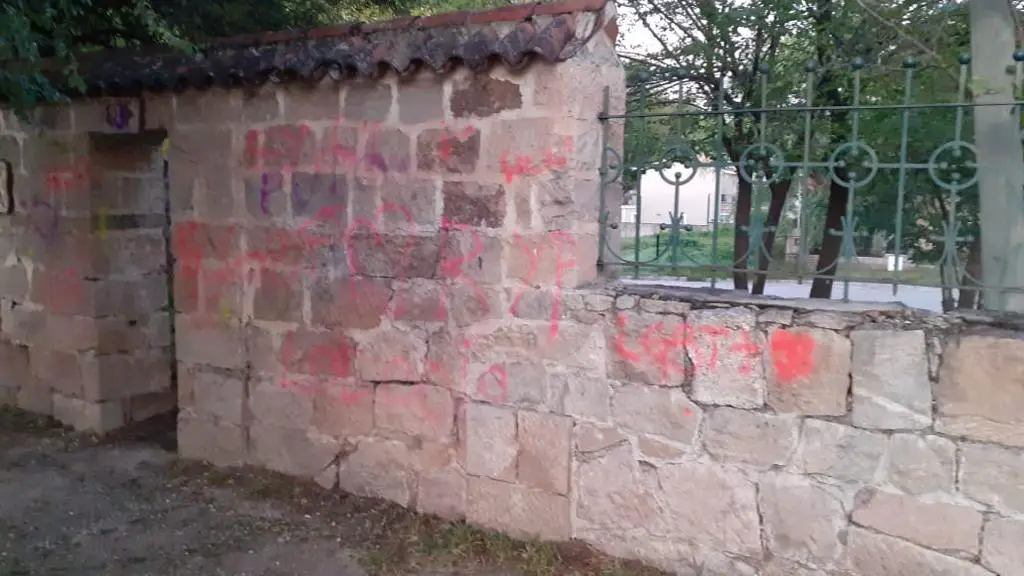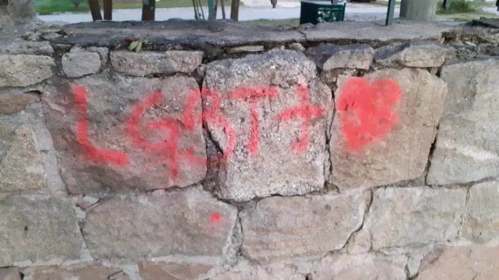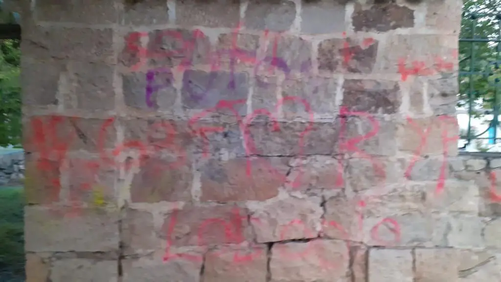 Las paredes del edificio fueron pintadas con aerosol con frases y dibujos.