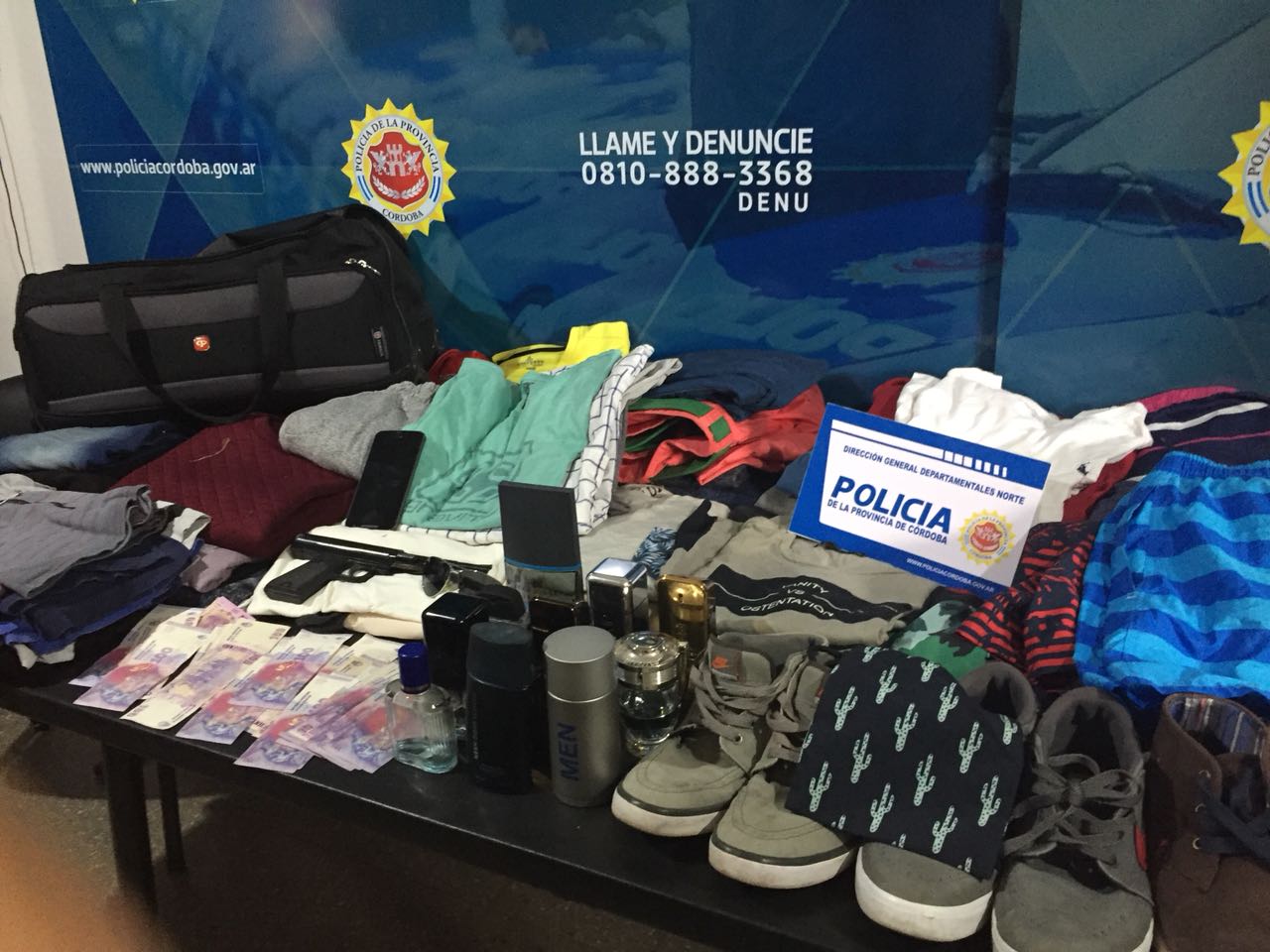 Así lo confirmó Félix Quinteros, director general de las Departamentales Norte: “Se secuestraron más de 60 prendas de vestir de distintas marcas, perfumes, telefonía celular, un arma de fuego, dinero en efectivo. Todo esto es producto de un robo que se originó el fin de semana donde resultaron damnificados once jóvenes oriundos de Monte Buey”.