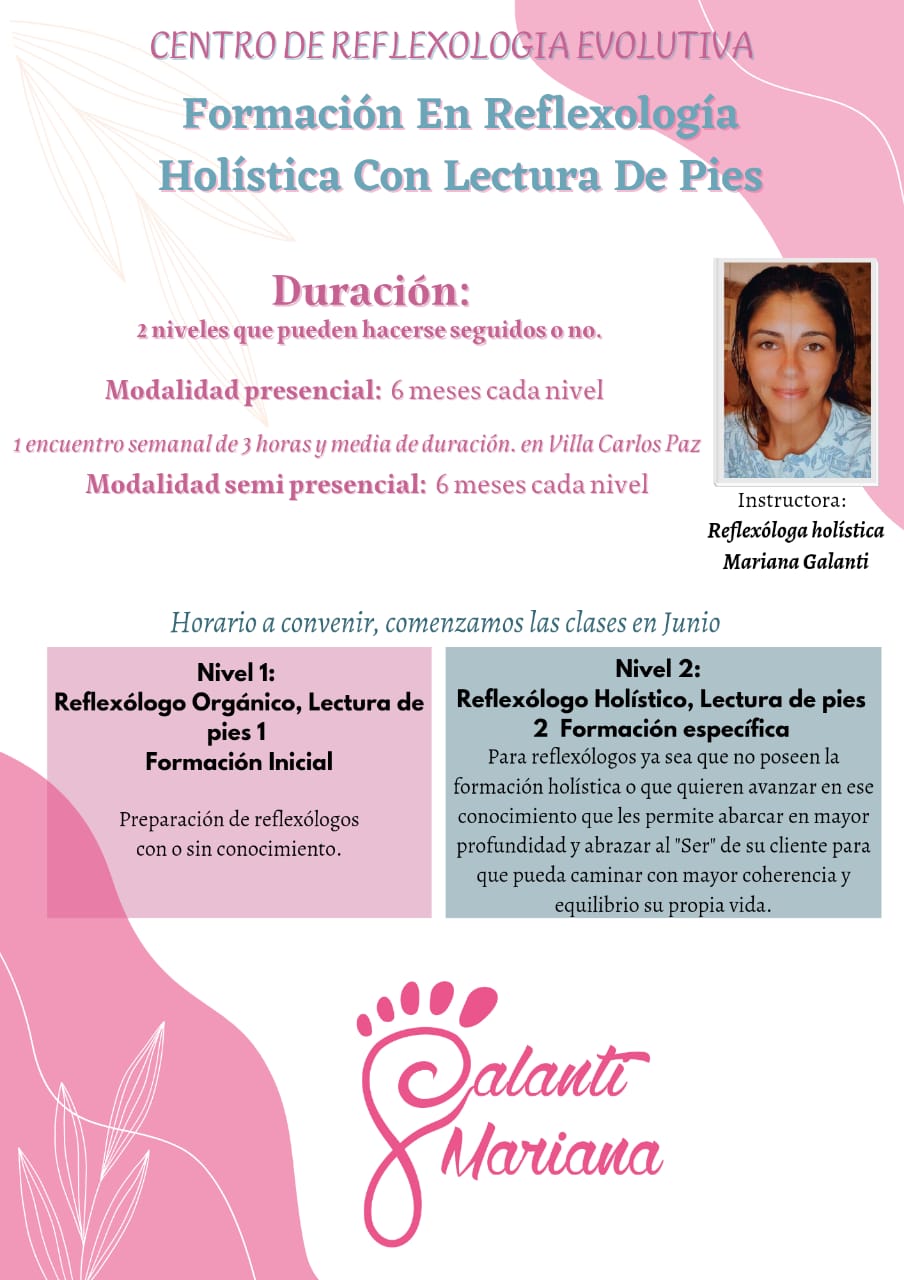 En Carlos Paz empezará en junio un curso de dos niveles dictado por Mariana Galanti, reflexóloga holística e instructora: «La reflexología holística en principio no es solamente un masaje de pies. Es una terapia que estimula el sistema nervioso, buscando que el organismo desde su propio saber comience su proceso de reequilibrio».