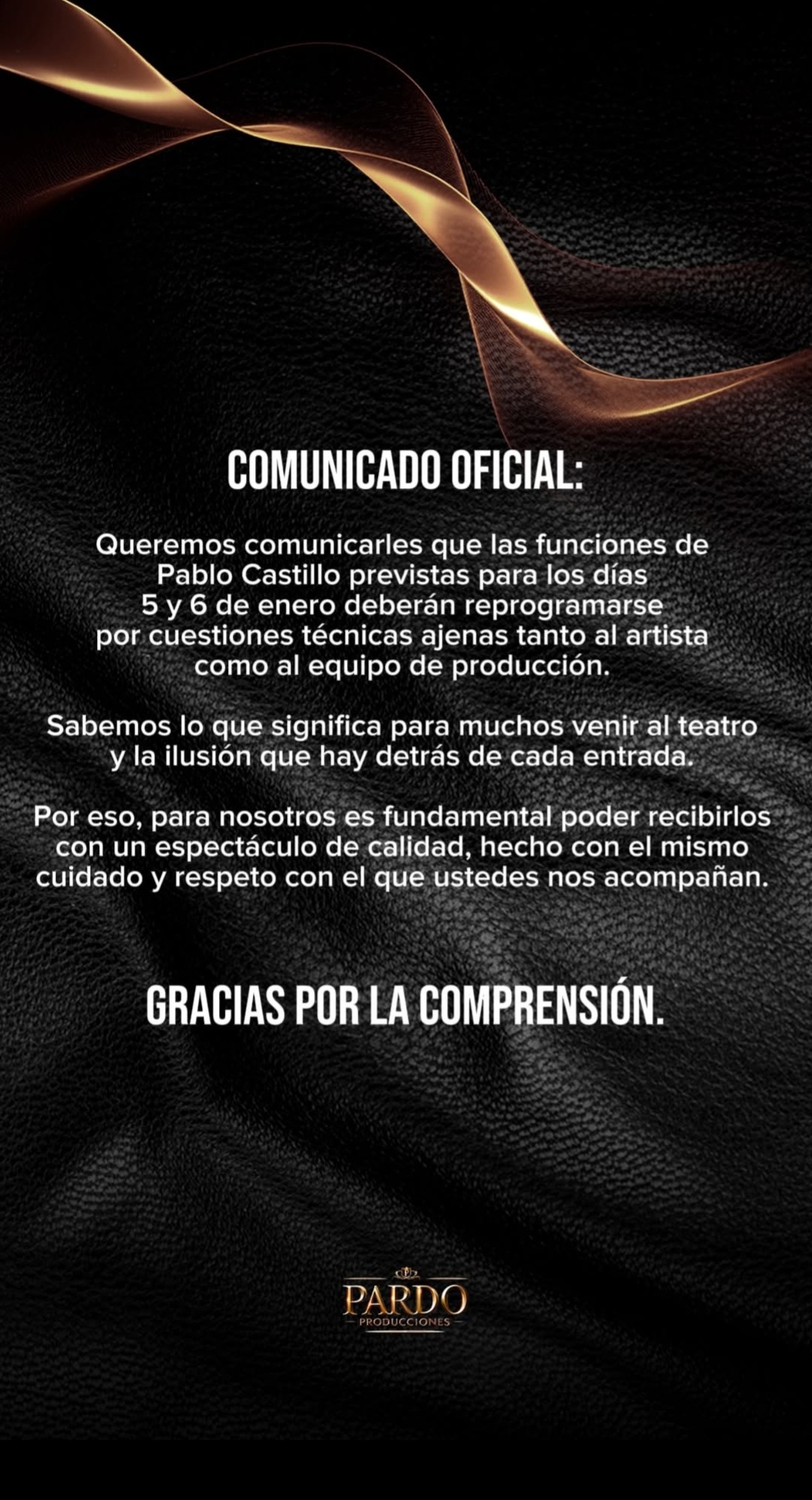 Finalmente, desde la productora agradecieron la comprensión del público y reafirmaron su compromiso con los artistas y con el trabajo profesional que hay detrás de cada espectáculo teatral.