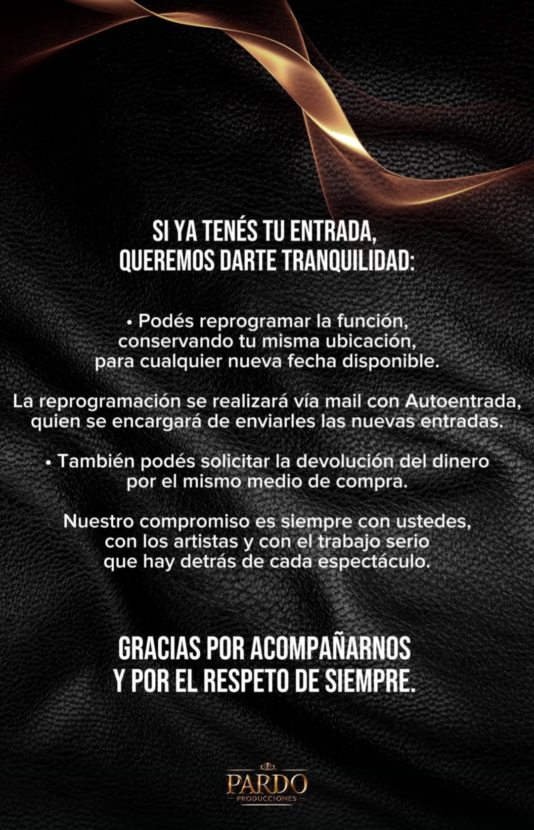 En cuanto a las entradas ya adquiridas, desde Pardo Producciones llevaron tranquilidad a los espectadores: quienes cuenten con tickets podrán reprogramar la función, conservando su misma ubicación, para cualquiera de las nuevas fechas disponibles. Este trámite se realizará vía mail con Autoentrada, que será la plataforma encargada de enviar las nuevas localidades.