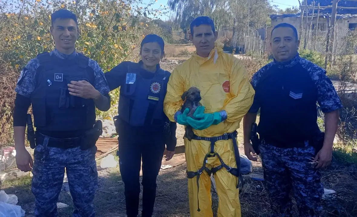 El hecho ocurrió en manzana C, lote 21, donde un cachorro mestizo cayó a una alcantarilla de 3 metros de profundidad que contenía líquidos cloacales. Los vecinos alertaron a las autoridades al notar que el animal no podía salir por sus propios medios.