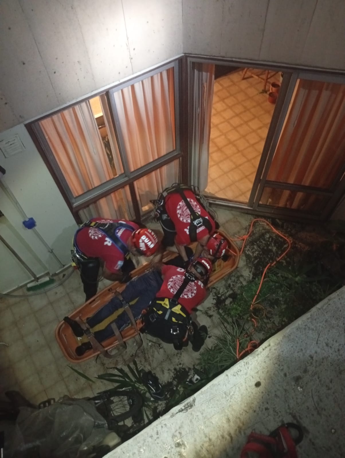 Mediante técnicas de camilla cesta, personal de Bomberos logró inmovilizarlo y extraerlo desde un piso 8º para luego ser asistido por el servicio médico del 107.