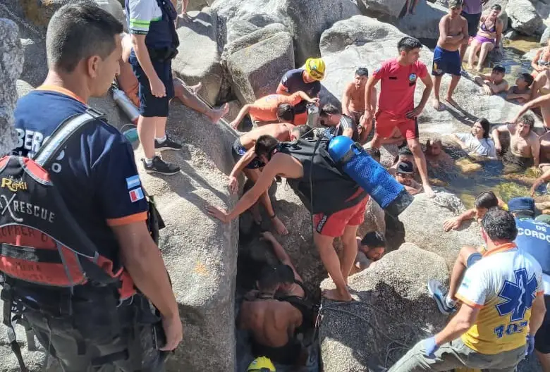 Guardavidas del lugar fueron quienes rápidamente alertaron a la Policía que el hombre se encontraba sumergido y atrapado entre la formación rocosa del cause en el sector de la cascada. Inmediatamente, llegó al lugar personal policial de Patrulla Preventiva, D.U.A.R, Bomberos Voluntarios de Mina Clavero, y ETAC, quienes montaron un operativo coordinado junto a los guardavidas para rescatar al hombre con vida.