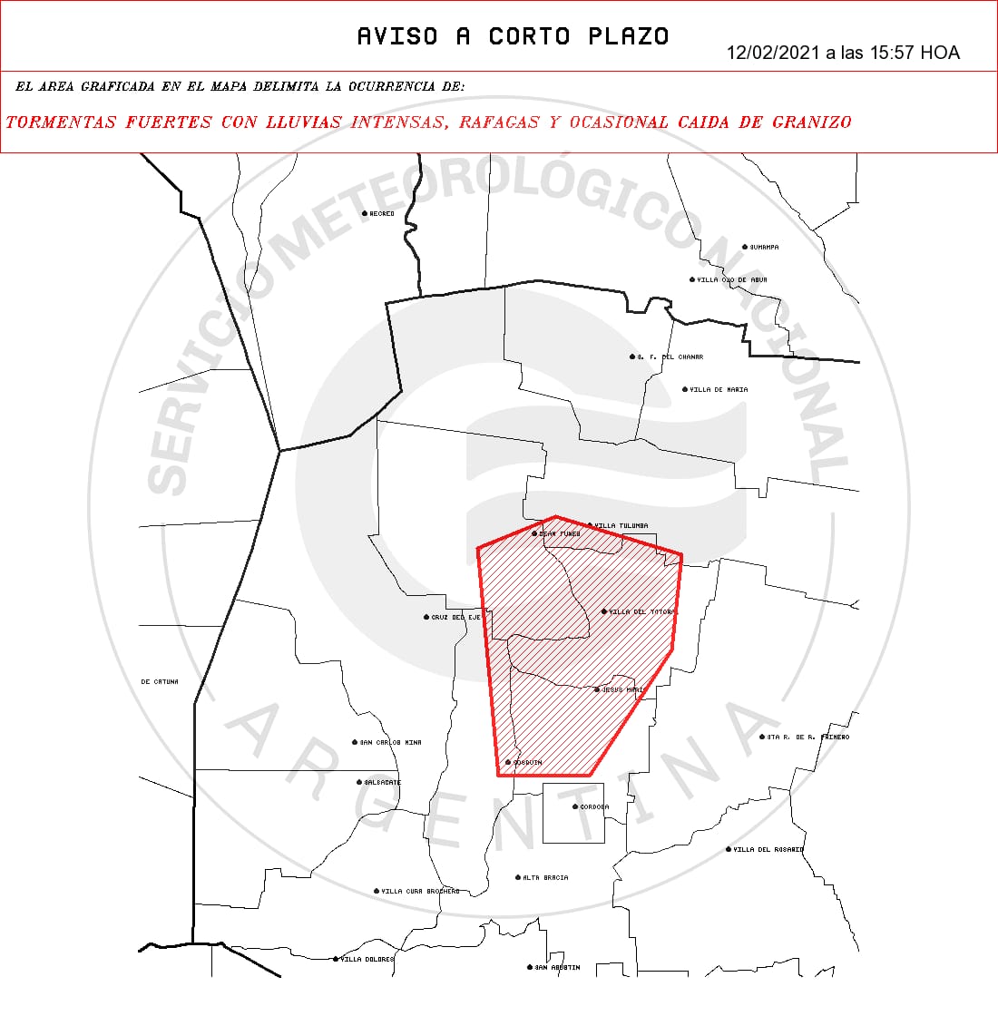 El Servicio Meteorológico Nacional emitió un “Aviso a corto plazo” por tormentas fuertes con ráfagas y ocasional caída de granizo para la tarde de este viernes.