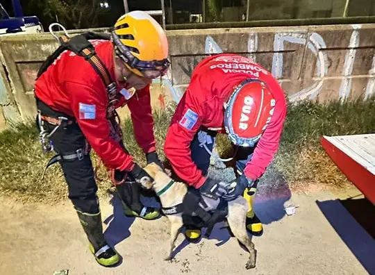 *Durante la noche del miércoles, efectivos del DUAR (Departamento Unidades de Alto Riesgo) de la Dirección de Bomberos lograron rescatar a un perro mestizo que había caído en un desagüe de 4 metros de profundidad en la intersección de calles Unión de los Argentinos y San Lorenzo, en el barrio Fénix.
