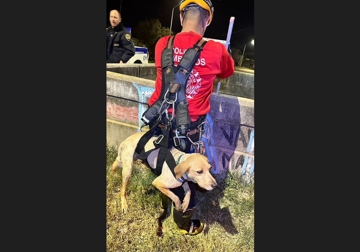 *Durante la noche del miércoles, efectivos del DUAR (Departamento Unidades de Alto Riesgo) de la Dirección de Bomberos lograron rescatar a un perro mestizo que había caído en un desagüe de 4 metros de profundidad en la intersección de calles Unión de los Argentinos y San Lorenzo, en el barrio Fénix.