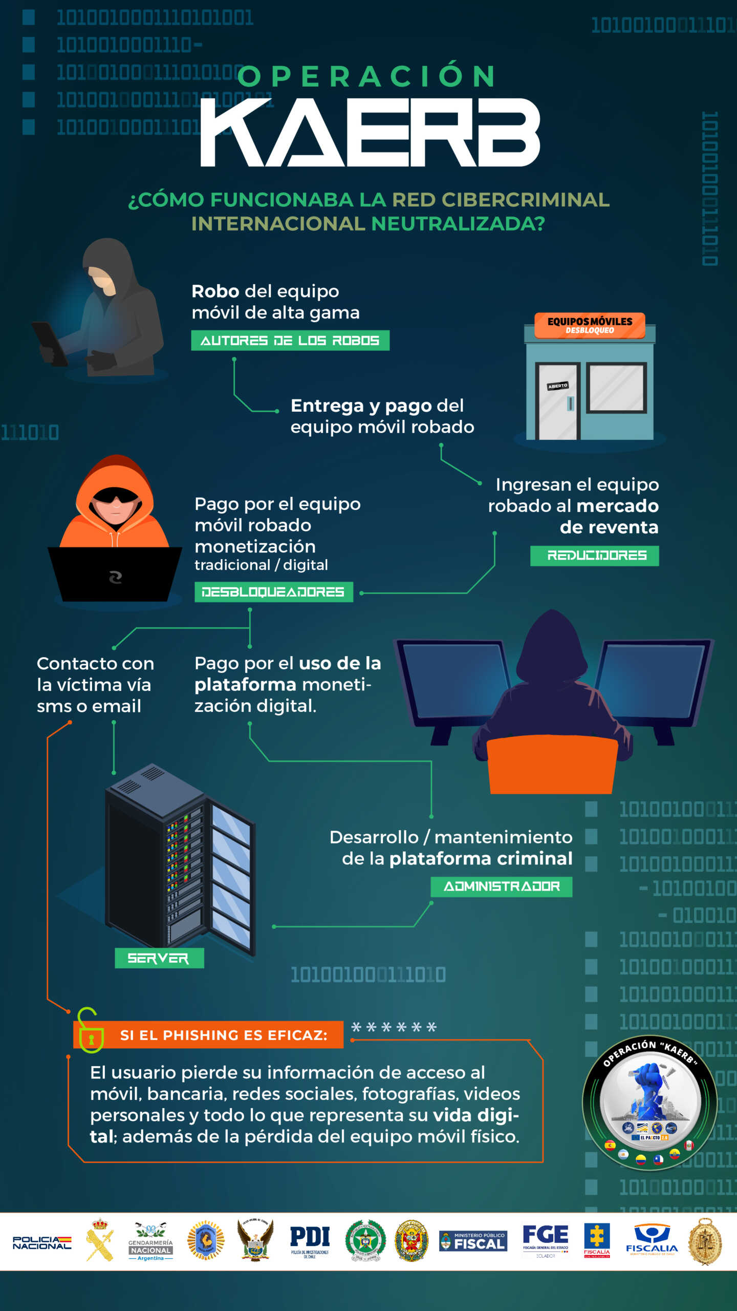 La banda robaba teléfonos móviles y, mediante técnicas de phishing, accedía a las credenciales y datos personales de las víctimas, usurpando su identidad digital. Posteriormente, realizaban fraudes y extorsiones, apoderándose de cuentas bancarias y otras plataformas digitales. La operación, que contó con la colaboración de Gendarmería Nacional, la Policía Federal Argentina, y fuerzas de seguridad de España, Colombia, Chile, Ecuador y Perú, culminó con la detención de 17 personas y el secuestro de 921 dispositivos tecnológicos.